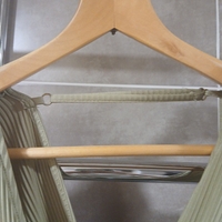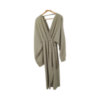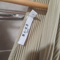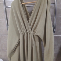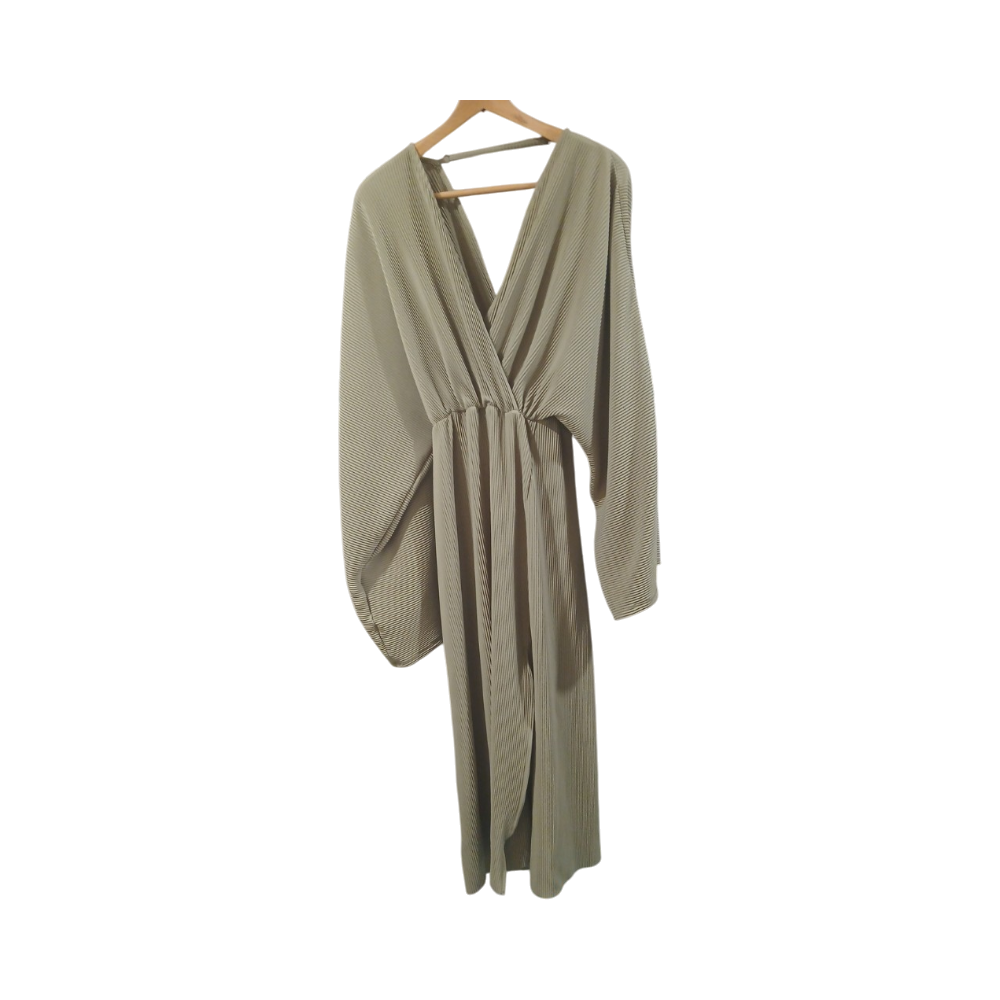 V-aukko, pitkät hihat, halkio helmassa, pliseerattu kevyt materiaali. Superkaunis mekko, muttei istu itselle.