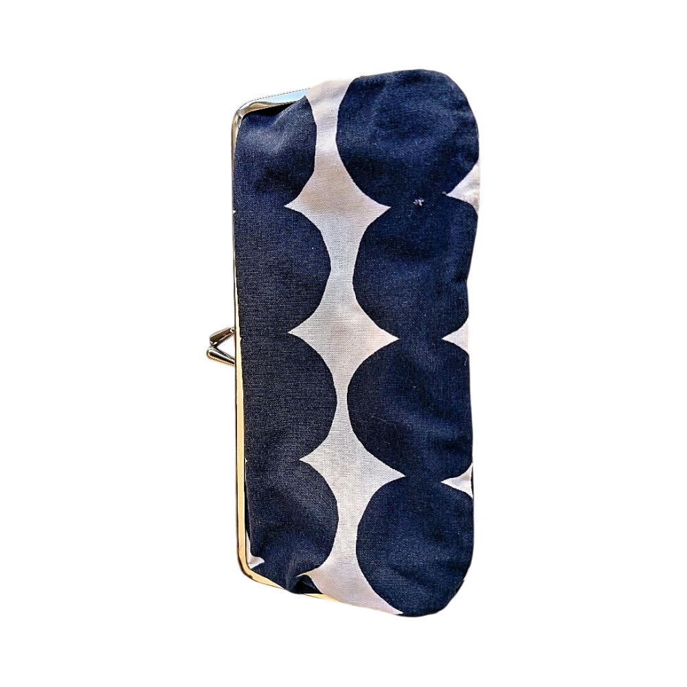 Marimekon mustavalkoinen kukkakuvioinen lompakko, metallikehys. Koko 8cmx18cm
