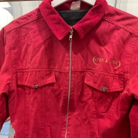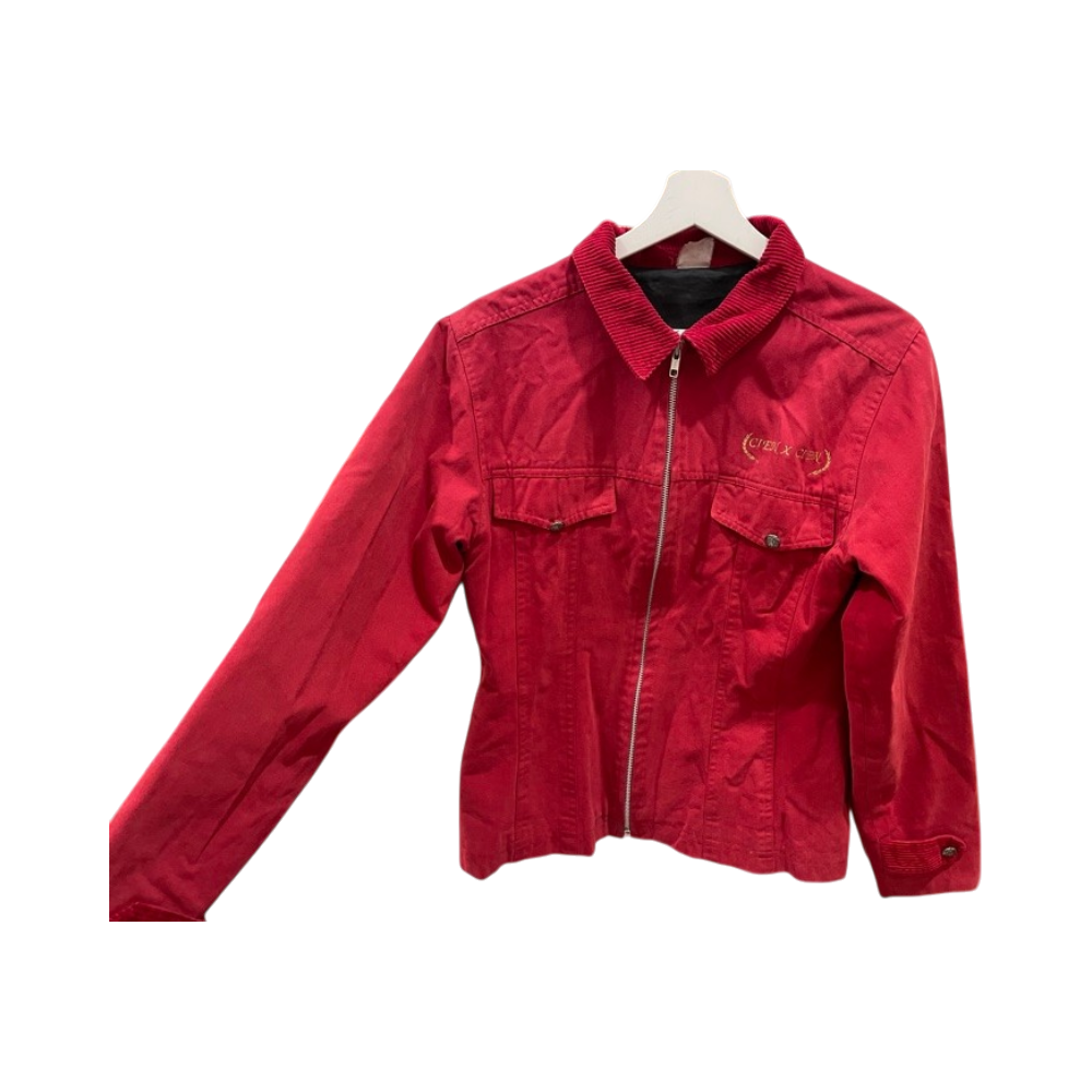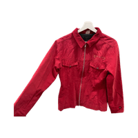 Punainen casual-takki, vetoketjulla ja kauluksella.