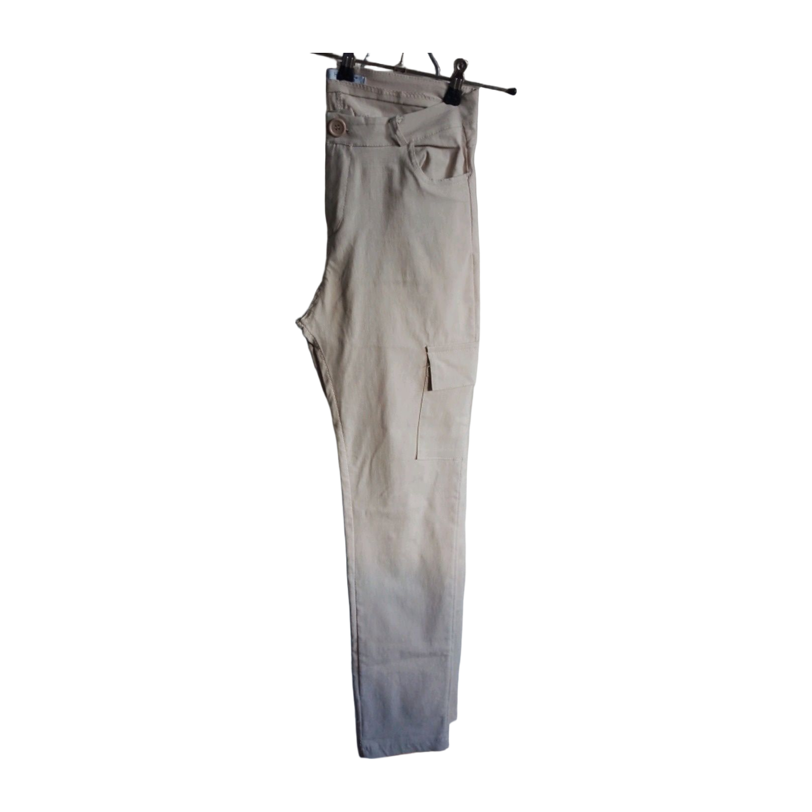 Kapealahkeiset, joustavat reisitaskuhousut. Vyötärönympärys 79cm, lahje haarasta 72cm, koko L.