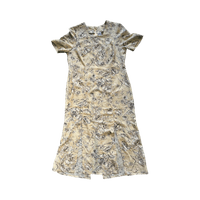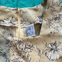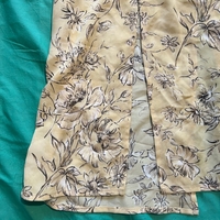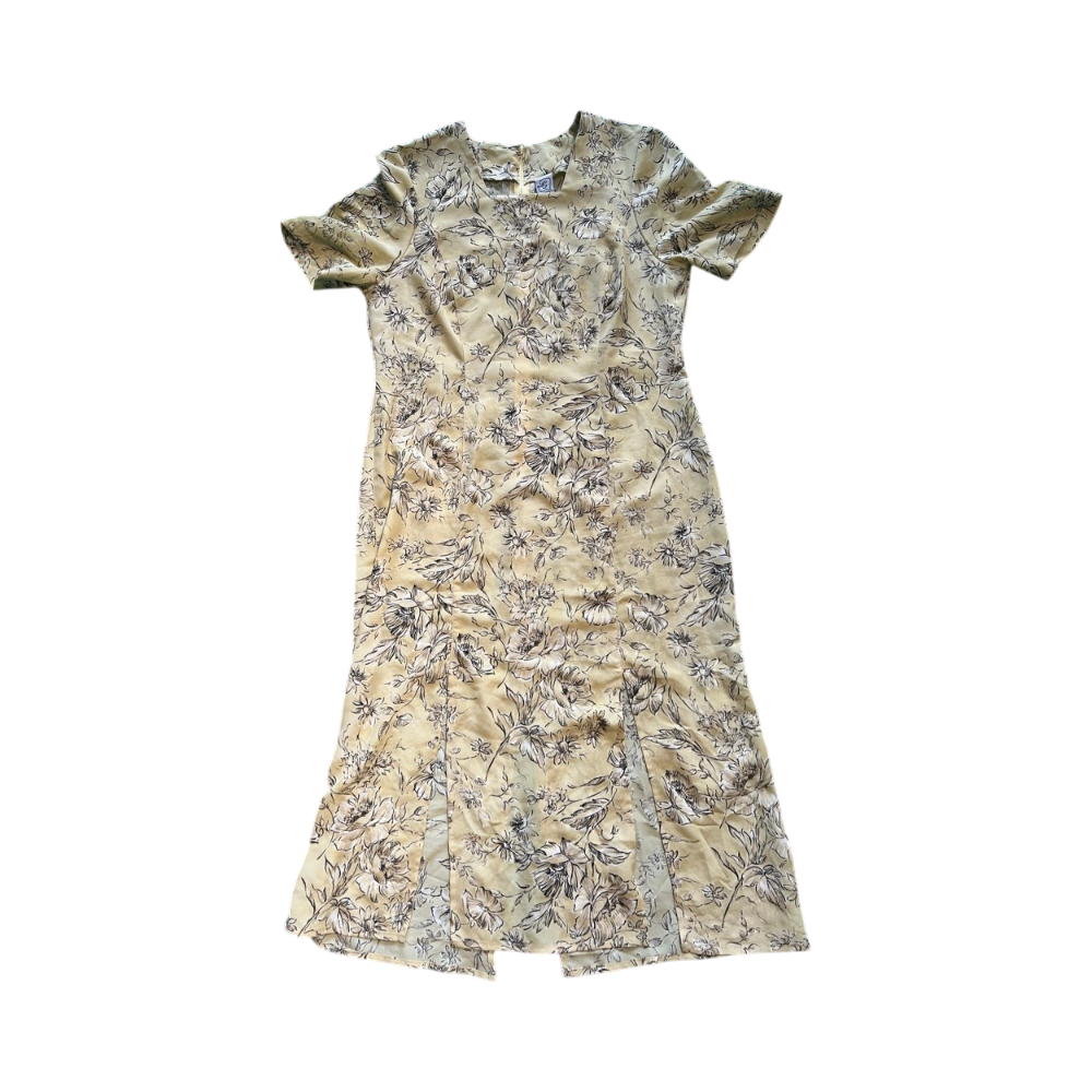 Vaaleankeltainen kukkakuvioinen maksipituinen kesämekko, vetoketjulla. Kaksi halkiota edessä.
