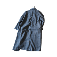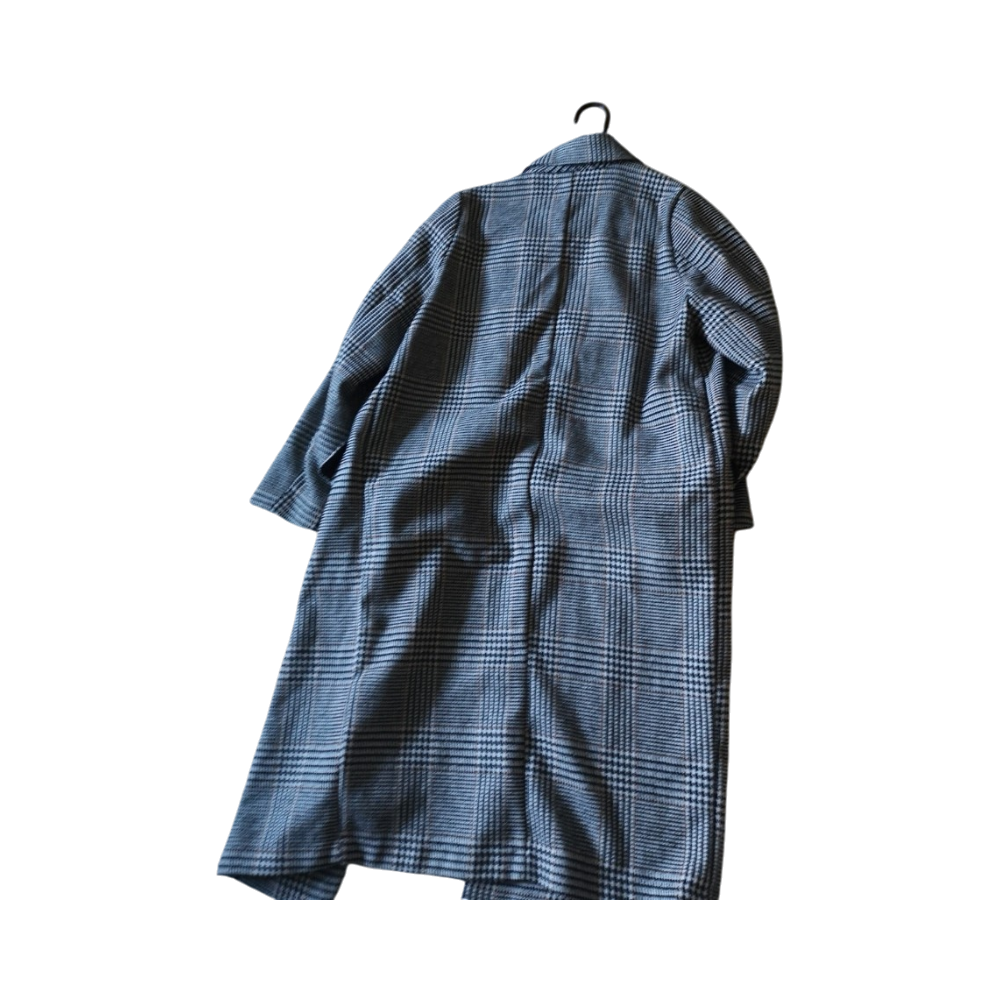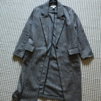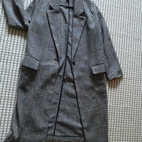 Pitkä, yksirivinen ruutupintainen naisten takki.