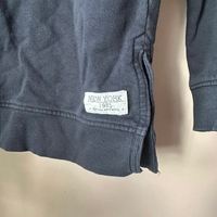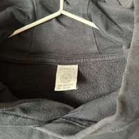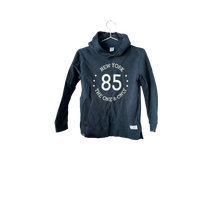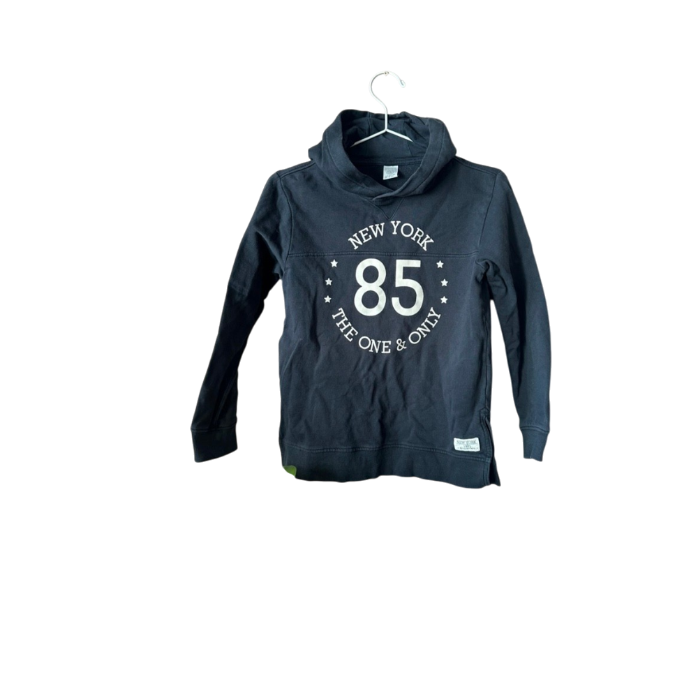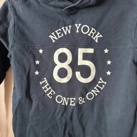 Pitkä, tummansininen huppari painatuksella, rennossa käytössä.