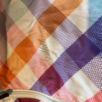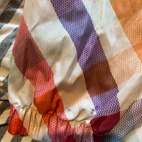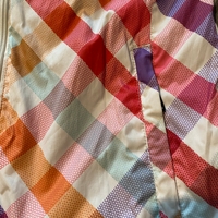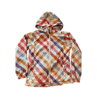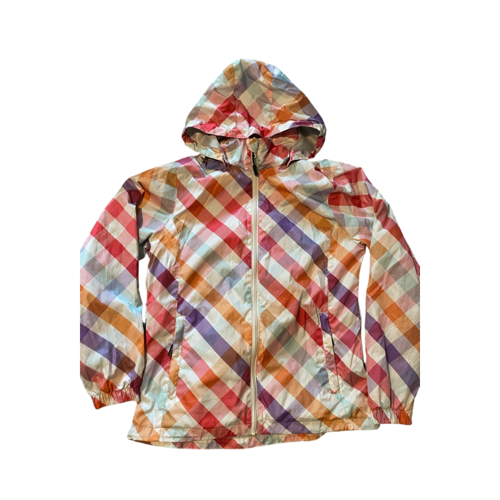 Kevyt, värikäs ruudullinen hupullinen tuulitakki. Taskut vetoketjuilla. Ehjä, pientä tahraa tullut.