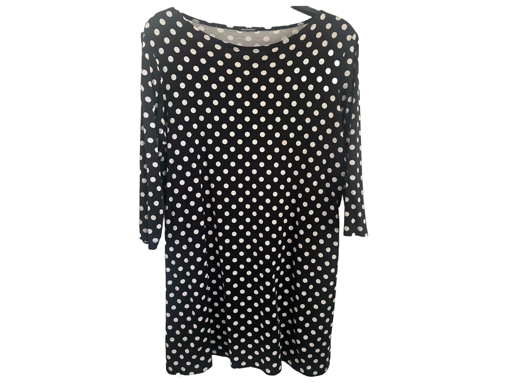 Musta mekko valkoisilla pilkuilla, 3/4 hihat. Pari krt pesty.