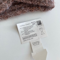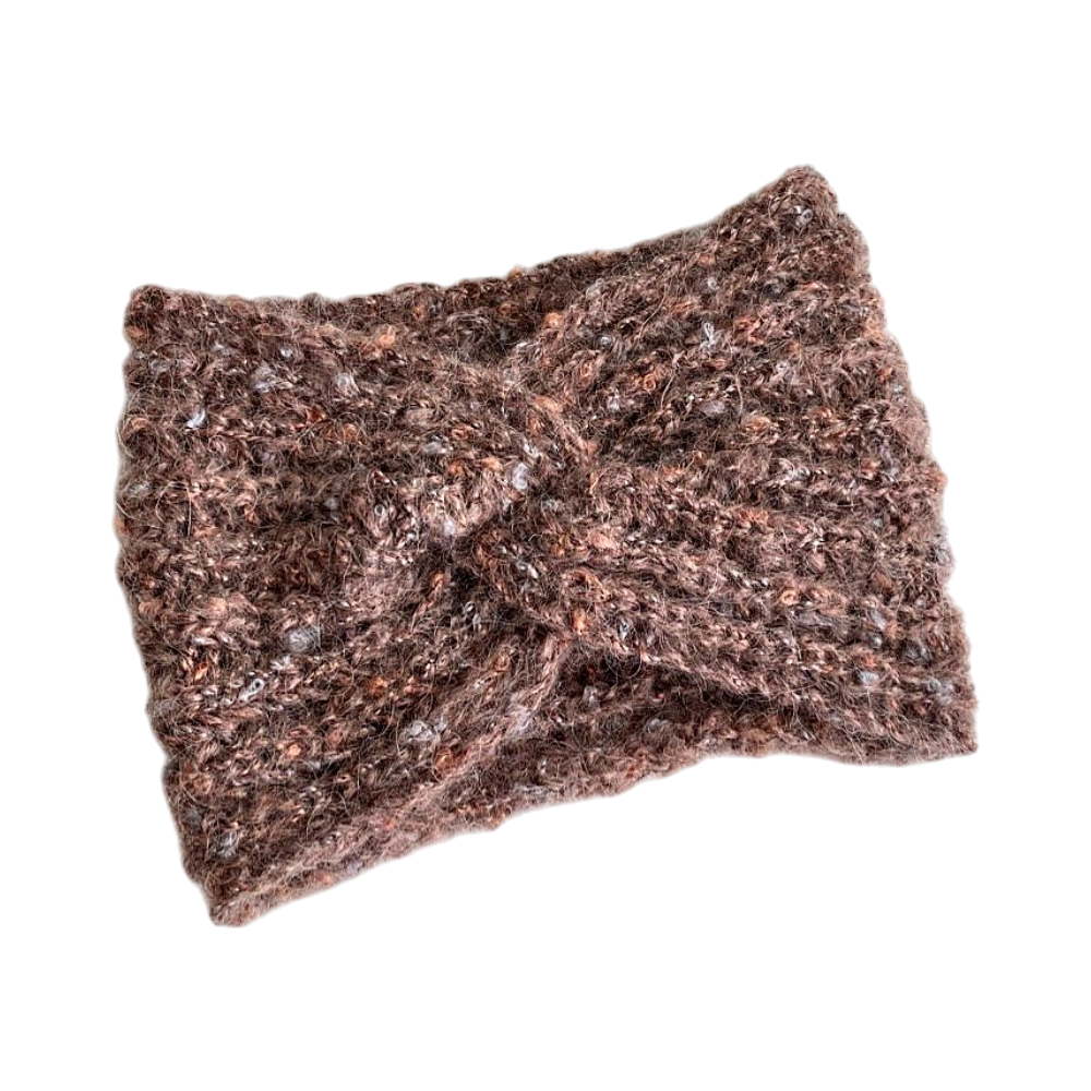 Ruskea käsintehty hiuspanta. Lanka 61 % polyakryylia, 25 % villaa ja 14 % polyesteria.