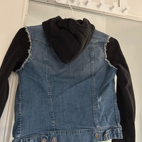 Sininen farkkutakki mustilla hupulla ja hihoilla, naisten malli.