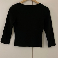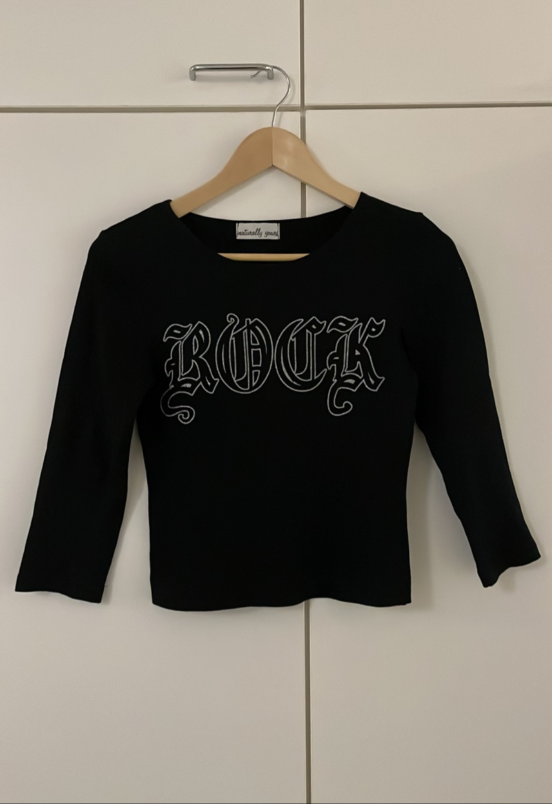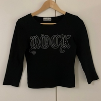 Musta pitkähihainen jossa edessä printtiteksti ROCK. Lapput leikattu mutta koko noin XS ja pehmeää puuvillaa. Hihat 3/4 ja helma tulee noin samaan kohtaan. Erittäin hyvässä kunnossa