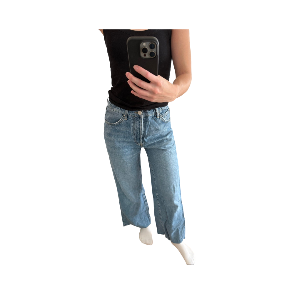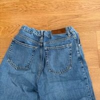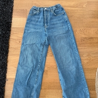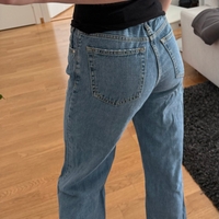 Light blue high-waist straight-leg denim jeans, relaxed fit.