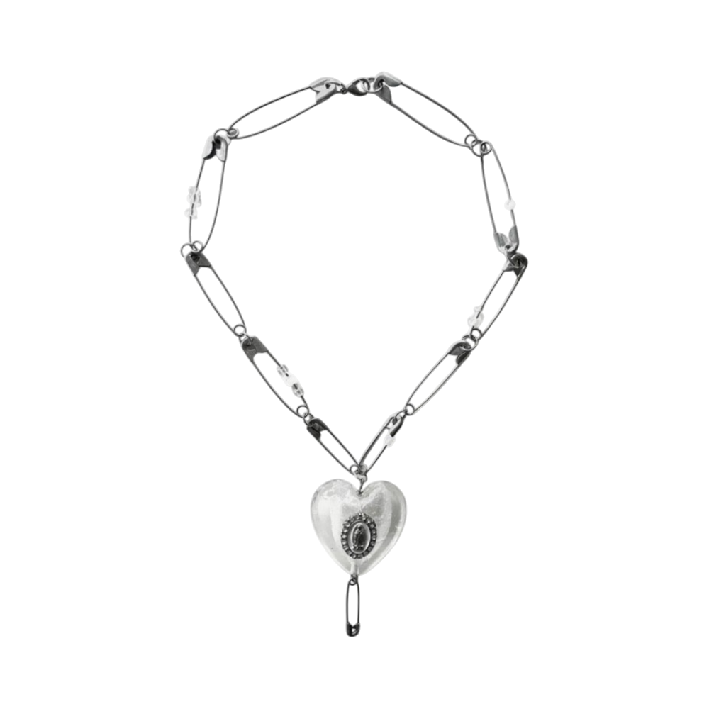 Koristeellinen sydänriipus hopeanvärisellä ketjulla.