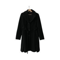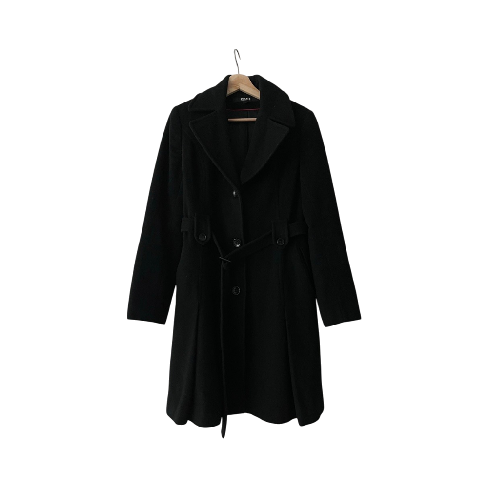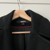 DKNY musta villakangastakki, koko US 4 eli vastaa S. Takki on 70 % villaa, 20 % nylonia ja 10 % cashmerea.