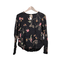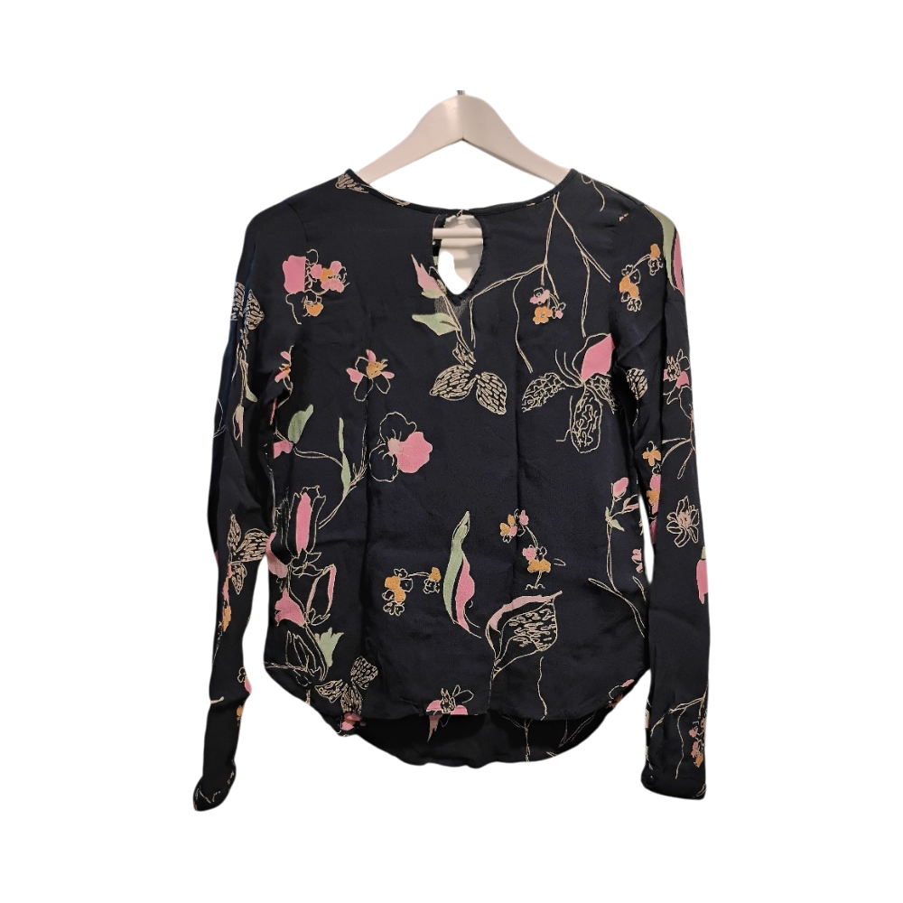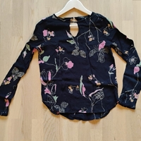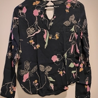 Kevyt pitkähihainen kukkakuosinen pusero, hyväkuntoinen. Takana nappikiinnitys, jonka kiinnityslenkki löystynyt.