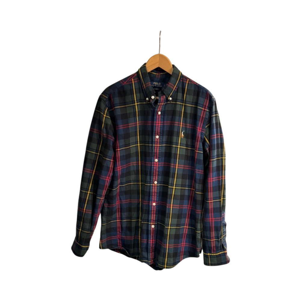 Long-sleeve button-up plaid shirt with embroidered logo.