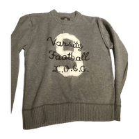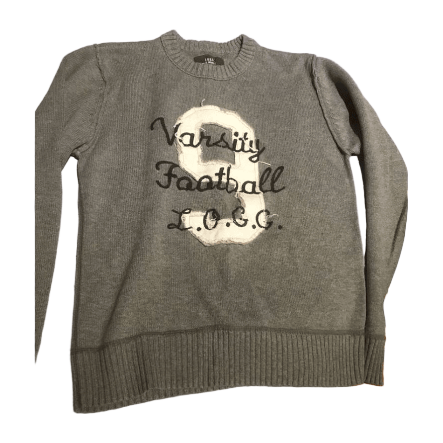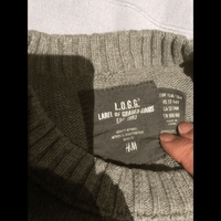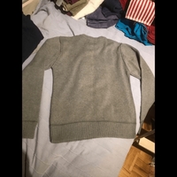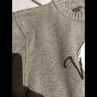Harmaa siisti ja ehjä neulepaita, jossa ommeltu printti rinnassa.