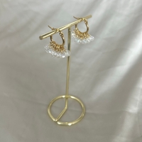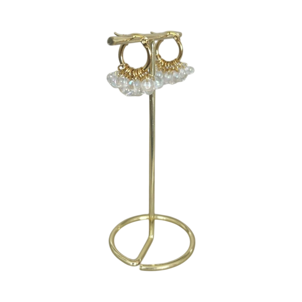 Käsintehdyt korvakorut lasihelmillä. Saatavilla sekä hopeisena että kultaisena. Renkaan halkaisija noin 1,5 cm. Lasihelmistä huolimatta hyvin kevyet