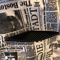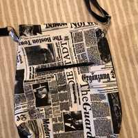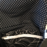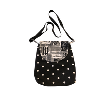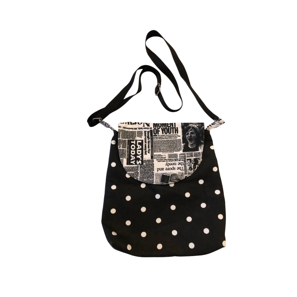 Itsetehty musta-valkoinen vuorellinen kangaslaukku. Sisällä ja takana vetoketjutaskut. Säädettävä hihna 60-120 cm. Laukun leveys 25, korkeus 28 ja syvyys 5 cm. Läpässä magneettilukko.