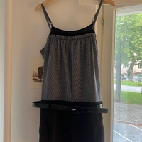 Raidallinen monitoimitoppi yhdistetty mustaan minihameeseen.