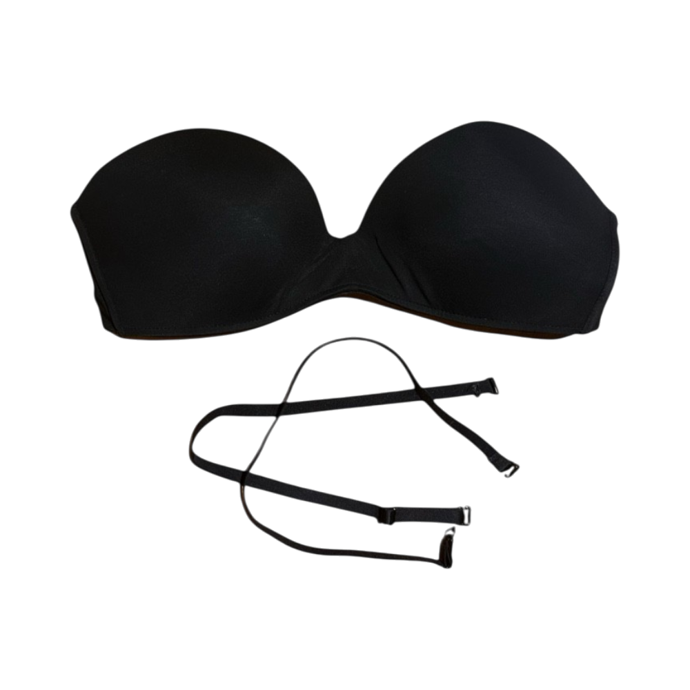 Black strapless padded bra with detachable straps, good support.