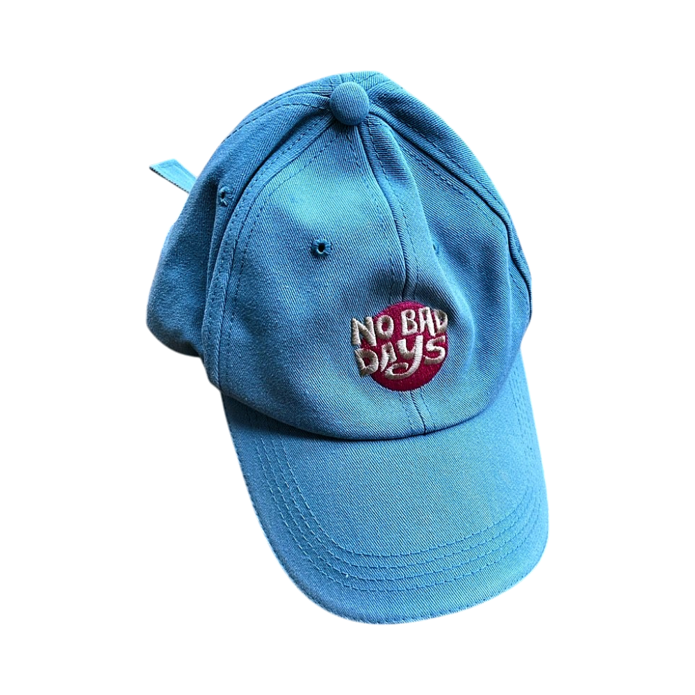 Vaaleansininen lippalakki, jossa pinkki kirjailu edessä. Hyvässä kunnossa!