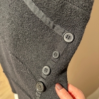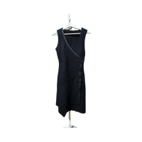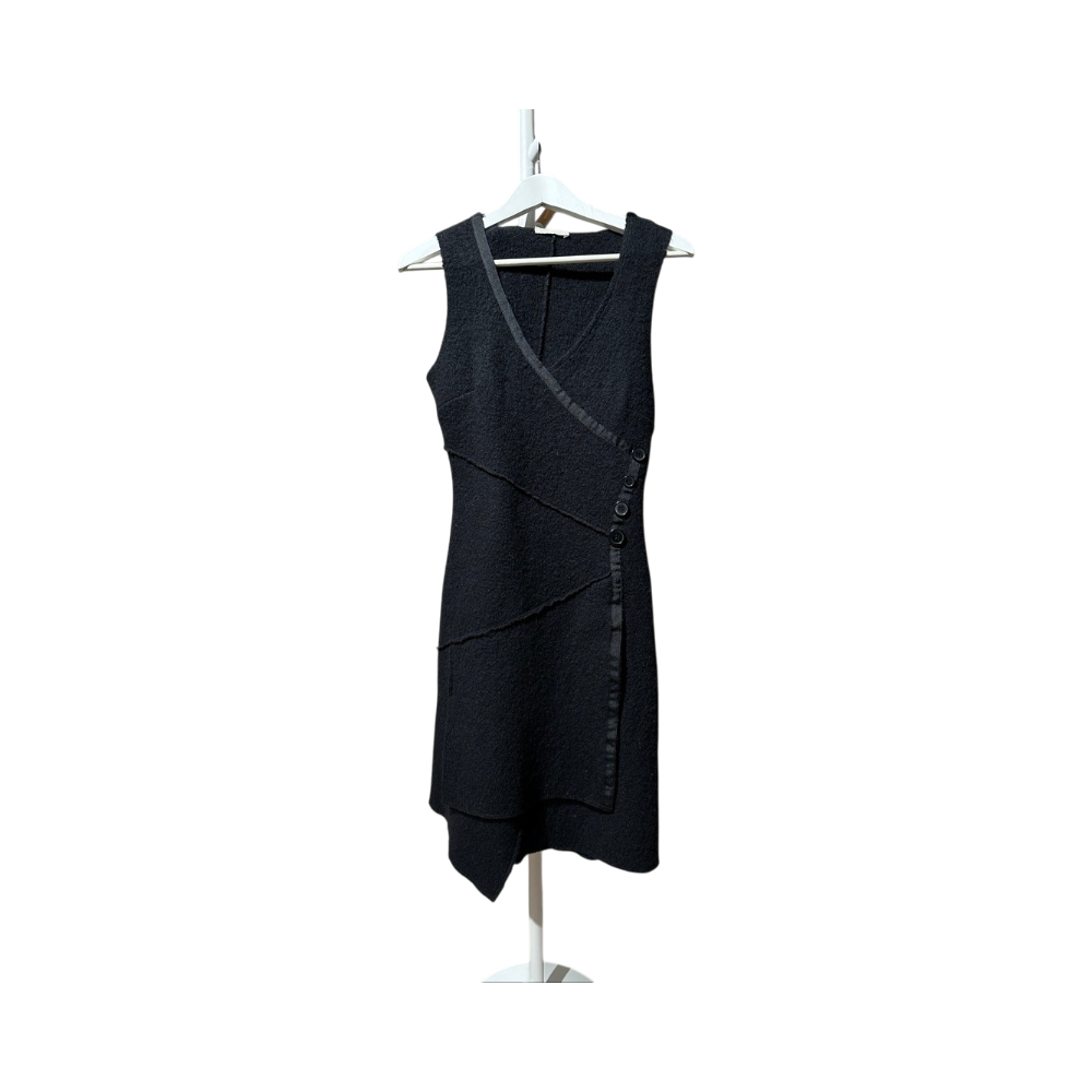 V-neck sleeveless black wool dress with side button details.