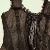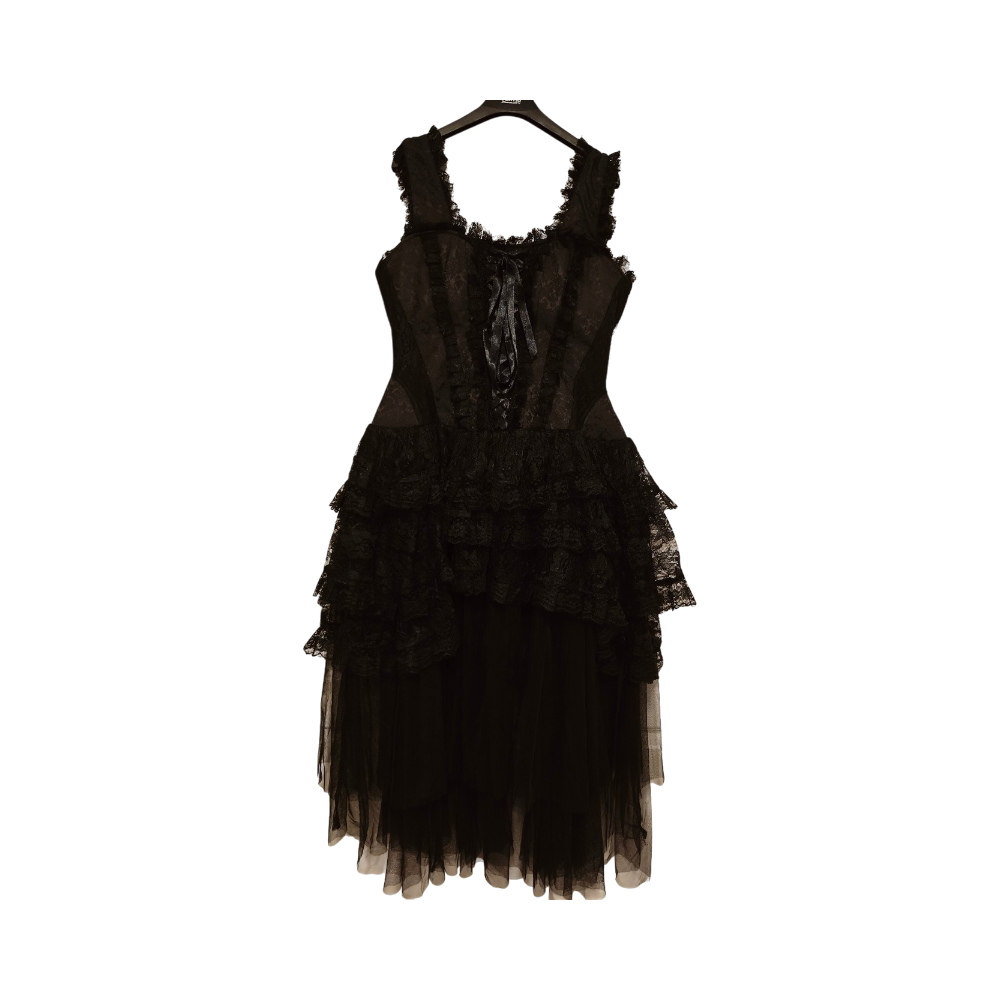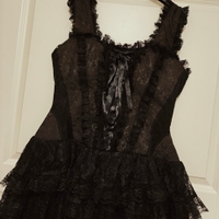 Korsettityylinen yläosa ja alaosa kerrostettua pitsiä/tylliä. Säätövaraa hyvin! Kaikin puolin erittäin laadukas mekko 🖤💯 M/L