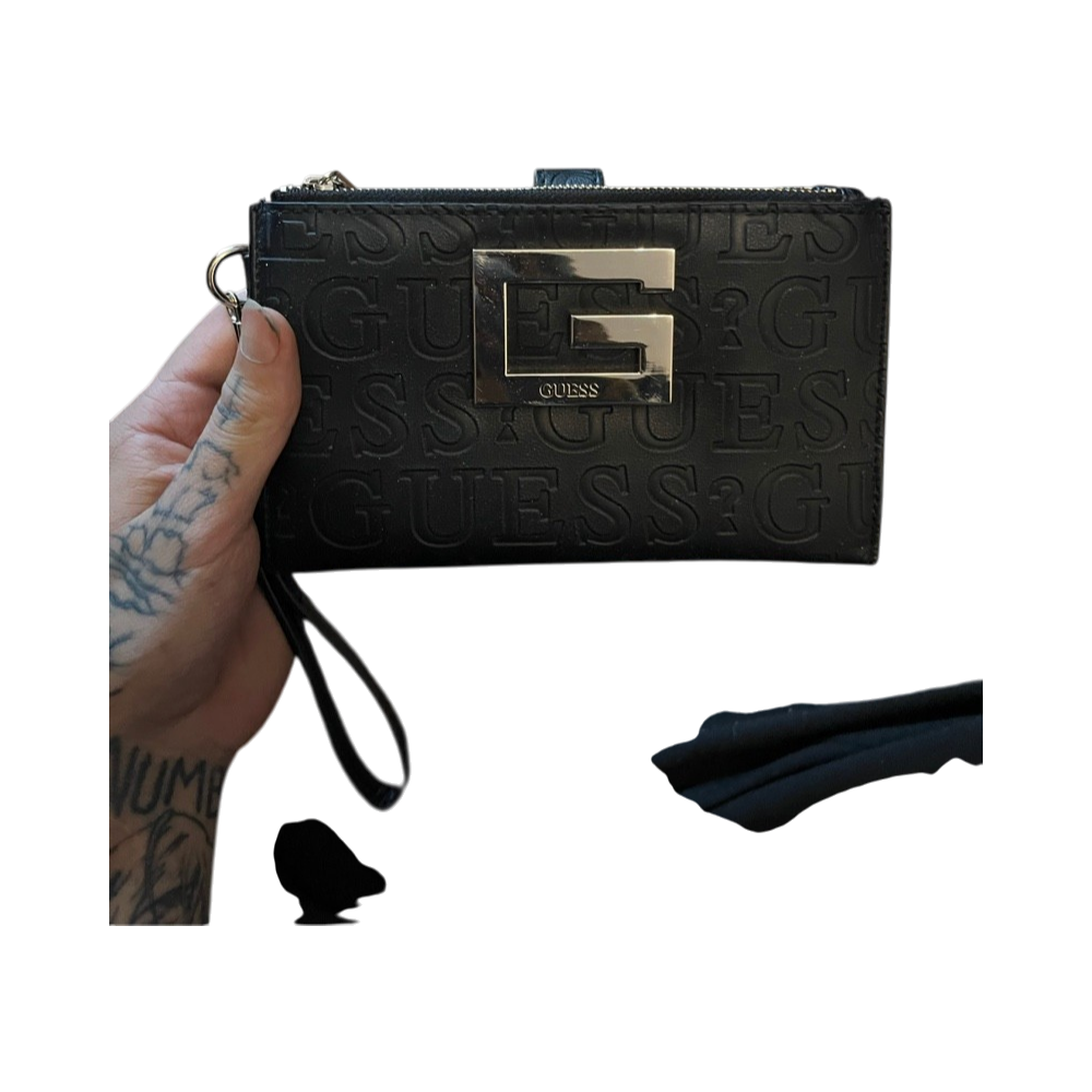 Mustaa LOGO-kuvioitua lompakkoa, metallinen G-solki ja rannelenkki.
