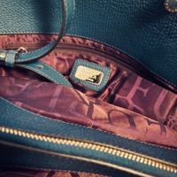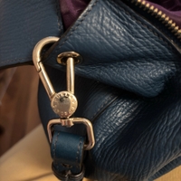 Irrotettava olkahihna, vetoketjulliset taskut ulko- ja sisäpuolella sekä sisällä useita lokeroita. Kullanväriset metalliosat. Valmistettu Italiassa.