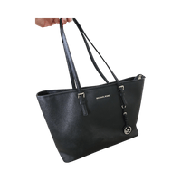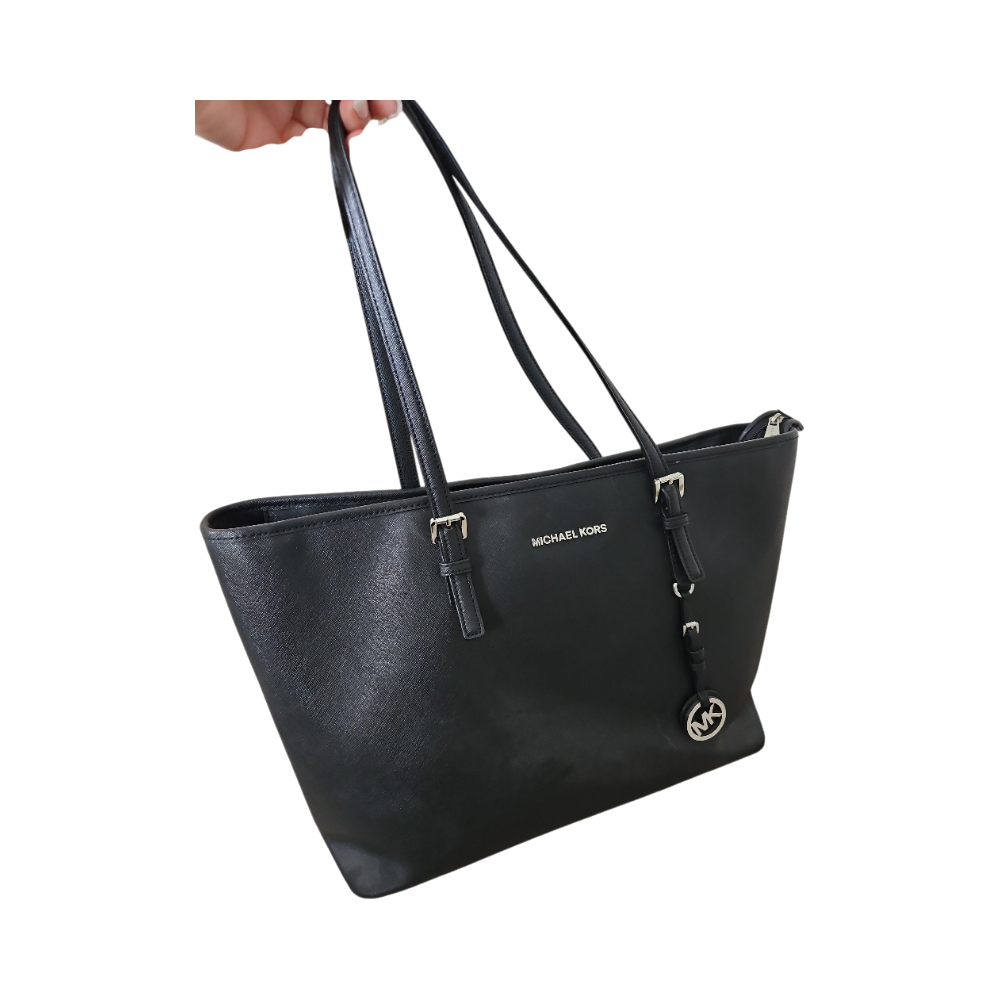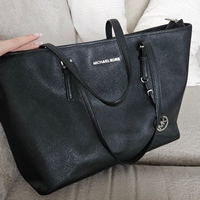 Spacious black tote with zippered compartments and logo charm.