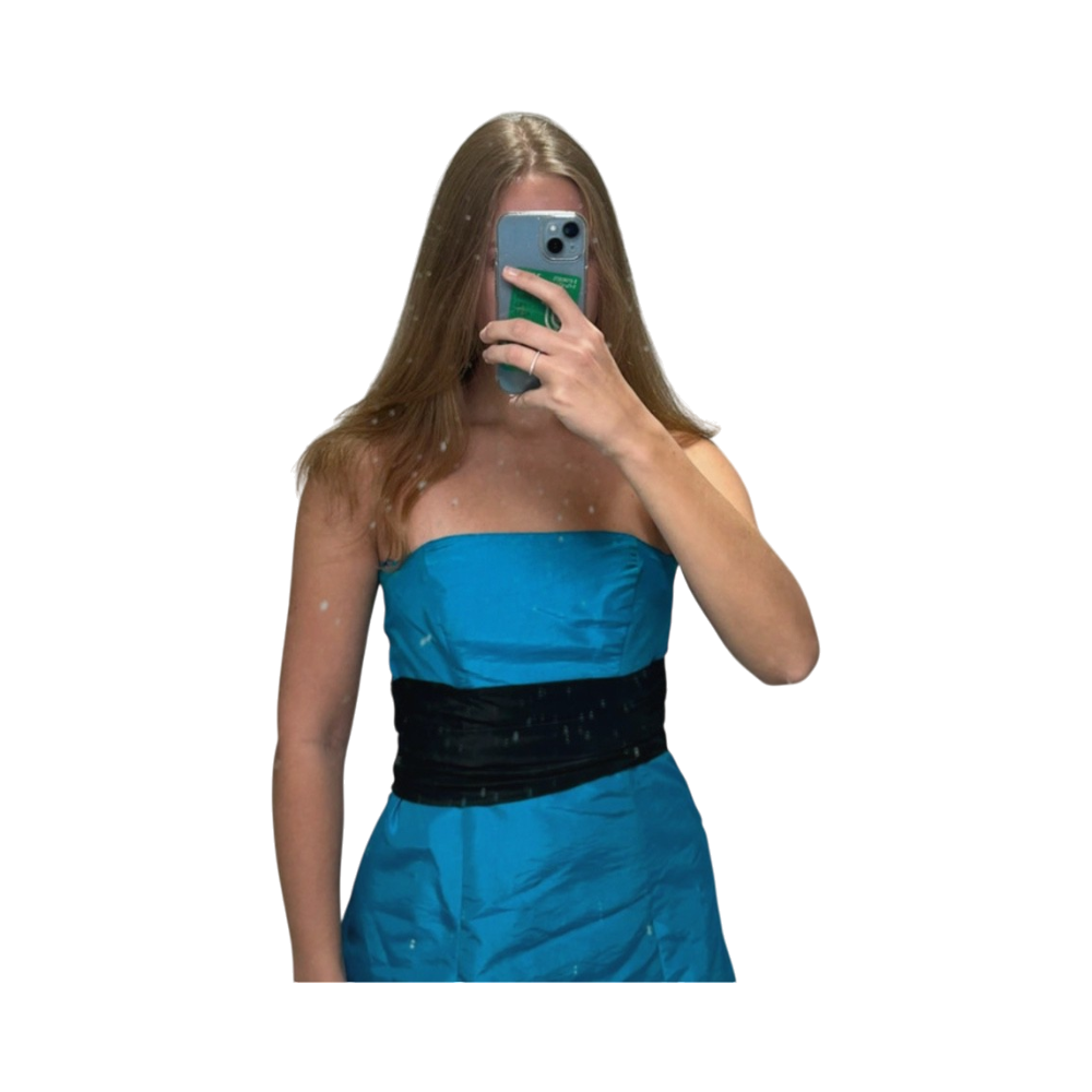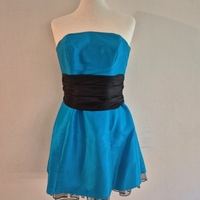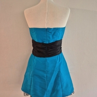 Turquoise strapless mini dress with black waistband and tulle hem.