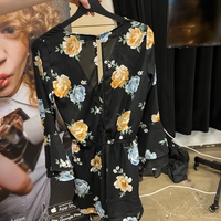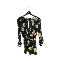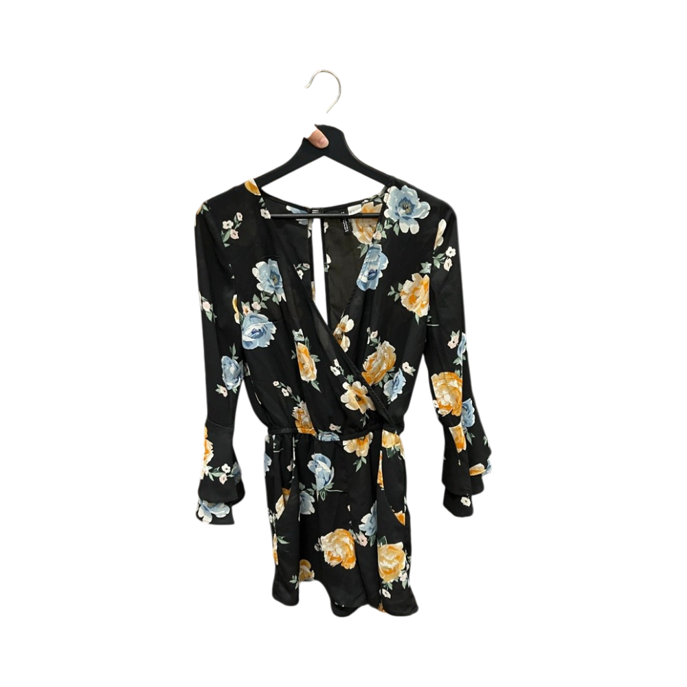 V-mallinen, pitkähihaistettu lyhyt one piece keltaisin ja vaaleansinisin kukin