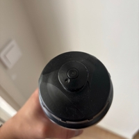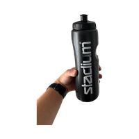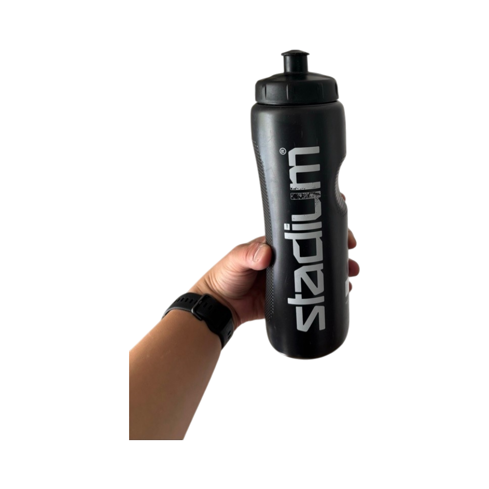 Muovinen juomapullo urheilukäyttöön, mukana korkki.