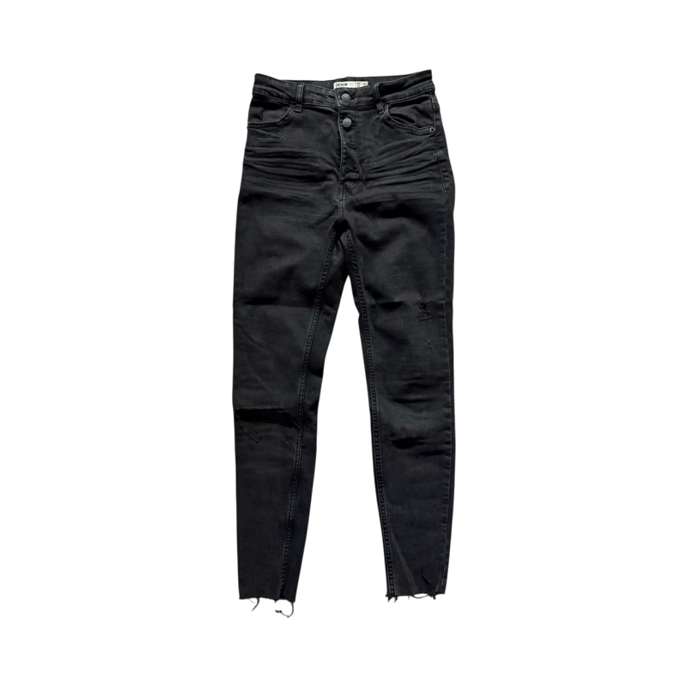 Korkea vyötärö, kapea lahje, kevyesti “distressed”