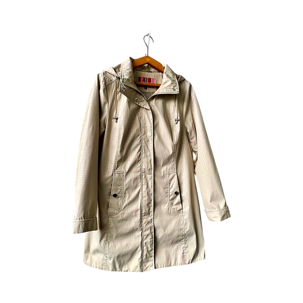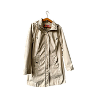Skila beige puolipitkä takki. Koko 38, kainalo-kainalo 53 cm ja pituus 85 cm. Kiinnitys edestä vetoketjulla ja napeilla. Takissa irroitettava huppu ja sivuilla taskut.