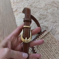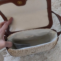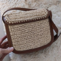 Punottu beige olkalaukku ruskeilla yksityiskohdilla, noin 22x20x8