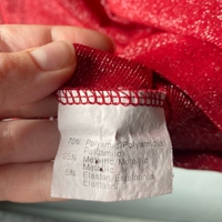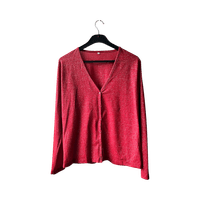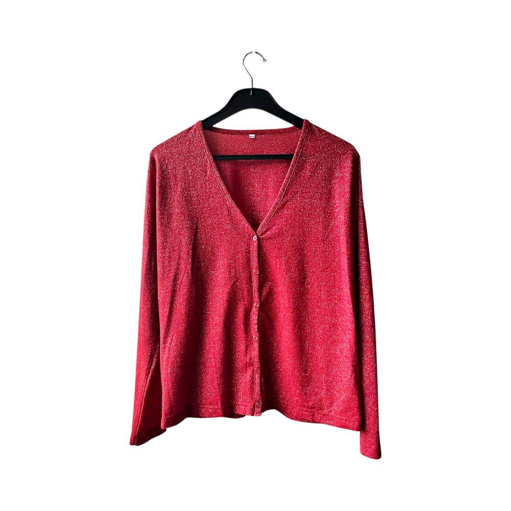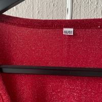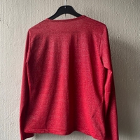Punainen kimaltava pitkähihainen metallikuitupaita esim. pikkujouluihin. Kainalo-kainalo 55 cm ja pituus 65 cm. Vastaa mielestäni kokoja L/XL.