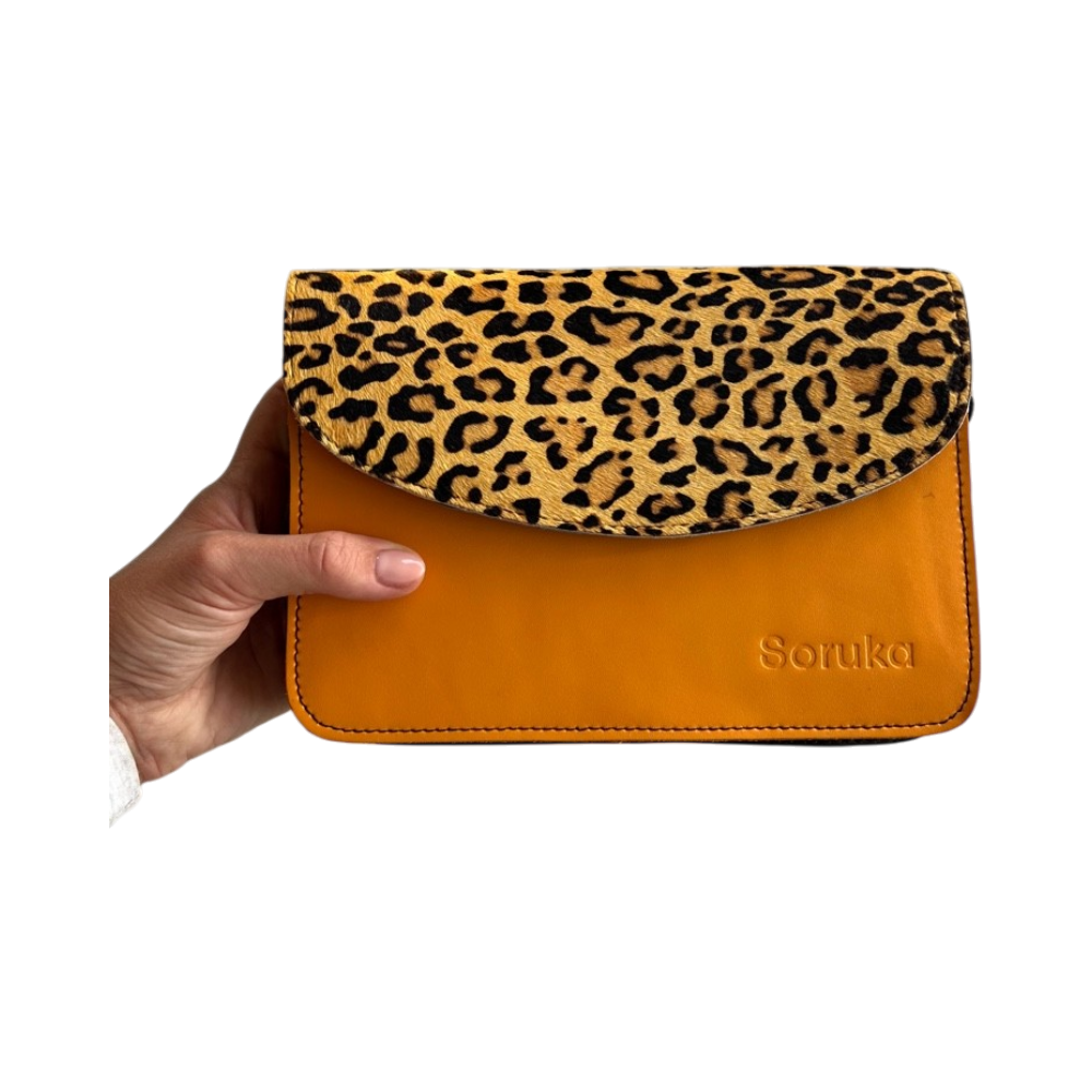 Espanjalaisen, vastuullisen brändin Sorukan ihana leo-nahkalaukku. Paljon yksityiskohtia. Voi käyttää clutchina, mutta mukaan tulee myös pitkä, säädettävä hihna, eli toimii myös crossbodyna. Käyttämätön ja virheetön! Ostettu reissusta tänä kesänä.