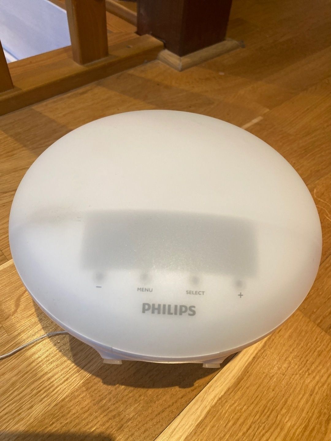 Philips Wake-up Light. Melko vähällä käytöllä ollut herätysvalo. Mukana kello ja radio.