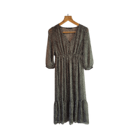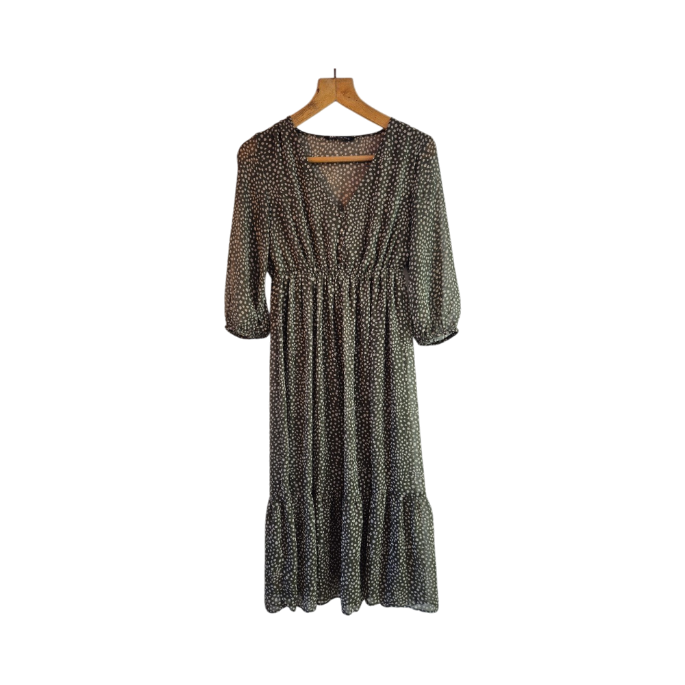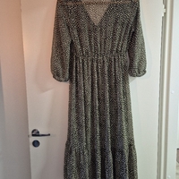 Pitkä midimekko, V-kaula-aukko, 3/4-hihat, laskostettu helma. Vihreä-valkoinen.