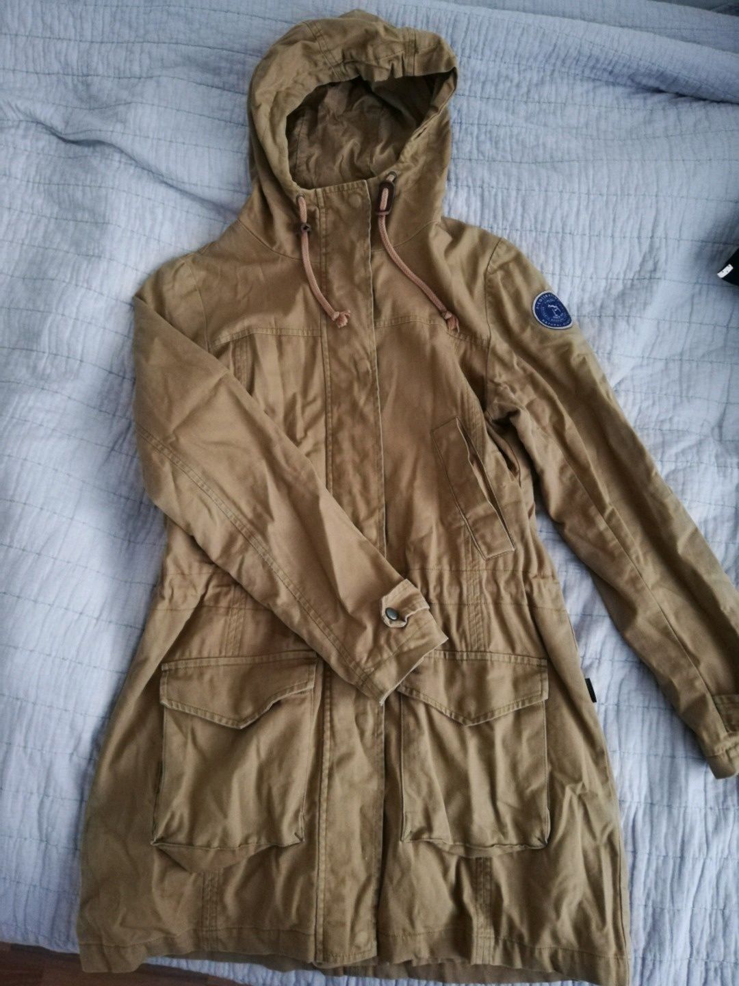 R-collection ihana vetoketjuparka ulkoiluun! Suojakäsitelty Aquatx joten pitää vettä jonkin verran. Vetoketju ja tuulelta suojaava nappilista. Sisäpuolella kiristysnyörit vyötäröllä. Upea retroväri!