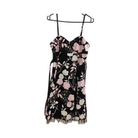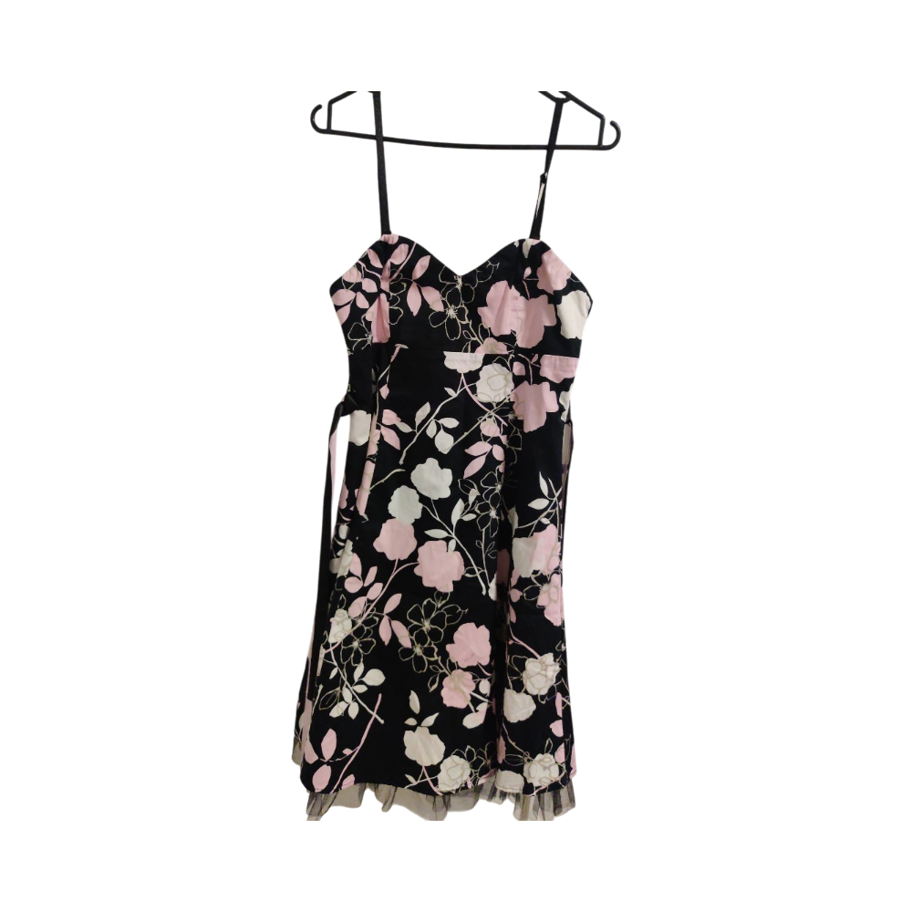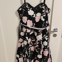Musta mekko vaaleanpunaisilla ja valkoisilla kukilla, olkaimellinen. Olkaimet saa irti. Tylliä helmassa, kaunis puolikellohame. Sopii juhliin. Muutaman kerran käytetty. Vastaa paremminkin kokoa 38/40.