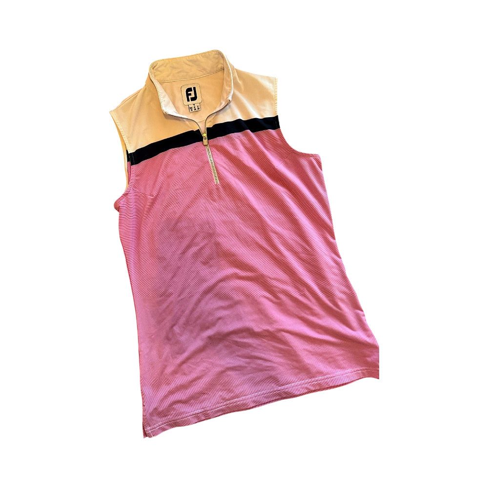 Sleeveless golf top with a quarter zipper. Features color blocking in pink and white. Tag size is M.