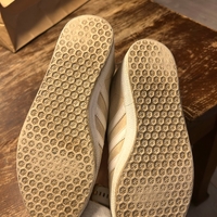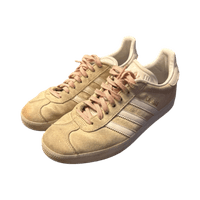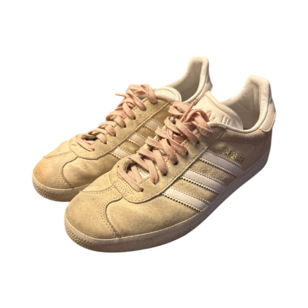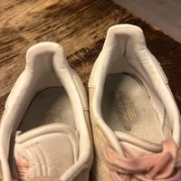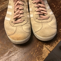 Puuterisen pinkit mokkanahkaiset tennarit, vaaleanpunaiset nauhat. Ottaneet osumaa kärkiin, mutta muuten ok kunnossa.