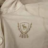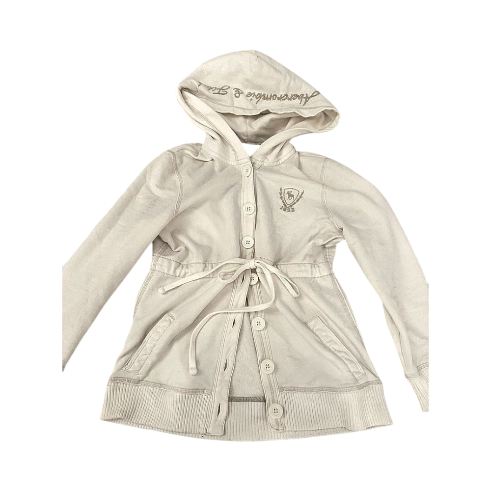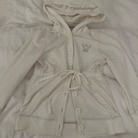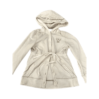 Hooded cardigan with button closure and drawstring waist. Cute embroidery details