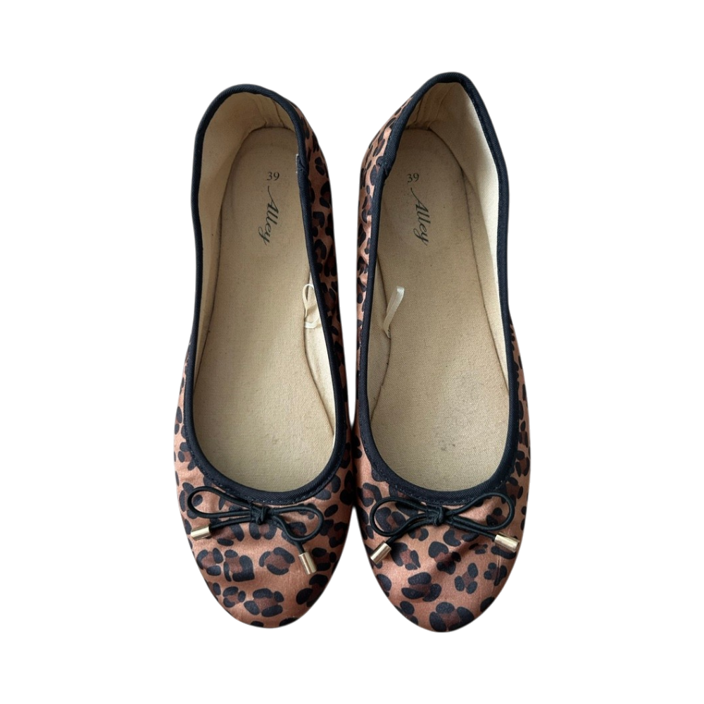 Käytetyt mutta edelleen hyväkuntoiset leopardi balleriinat. Toisen kengän pohjassa hintalappu, joka lähtee pois kävelemällä.