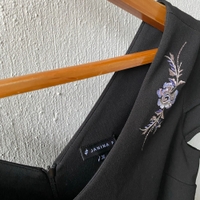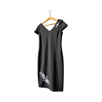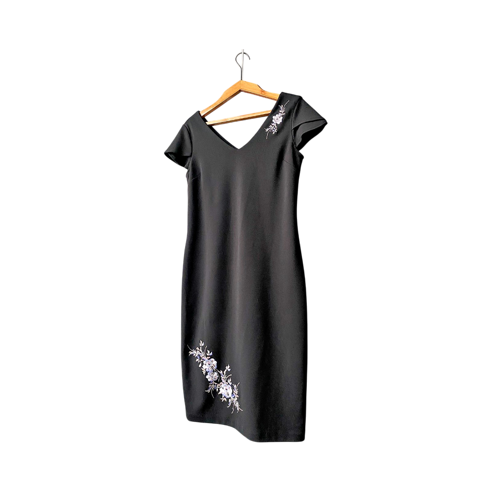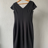 Musta midipituinen mekko. Koko 36, kainalo-kainalo 45 cm ja pituus 103 cm. Vuorattu, tyköistuva malli. Mekossa v-mallinen kaulus ja takana huomaamaton vetoketju.