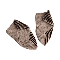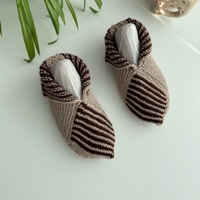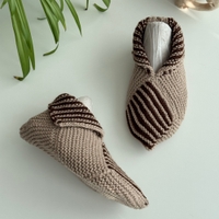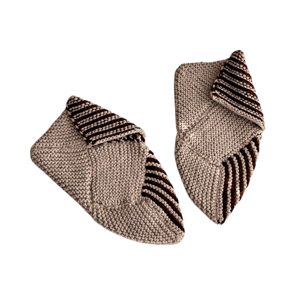Beige-ruskeat käsintehdyt tossut. Jalkapohjan pituus 23 cm ja sopivat n. 36–38-kokoiseen jalkaan. Tehty villalangasta.