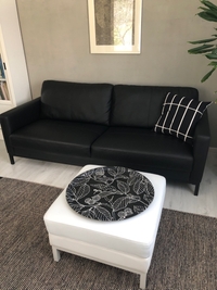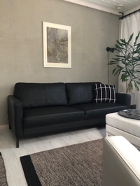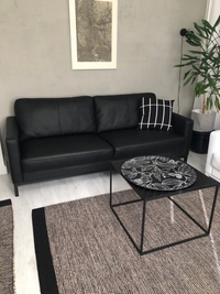 Black 3-seat Oslo sofa eli siistikuntoinen ja ajaton musta 3-istuttava nahka/keinonahkainen sohva. Ostettu 3.4.2020 Hoppy Hall - verkkokaupasta. Metallinen musta jalkaosa. Kiinteät istuintyynyt, selkänojatyynyt irrotettavat, pysyvät hyvin paikallaan tarranauhoilla. Sohva on helppohoitoinen, ja sitä on säännöllisesti imuroitu, pyyhitty ja selkänojatyynyjä vaihdettu päikseen. Tarkat mitat sohvasta tulee myöhemmin. (Leveys noin 2m, syvyys noin 90 cm.) Todella siistissä kunnossa ja vähäisellä käytöllä ollut. Ainoa näkyvä miinus on sohvan selkäpuolella, keinonahkaisessa pystysaumassa, jossa pientä harmaata osumaa/ jälkeä efektiseinästä. Saattaa lähteä poiskin, mutta varmasti helposti fiksattavissa, jos häiritsee. Sohvan tausta ja sivut keinonahkaa.