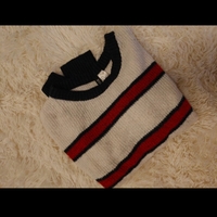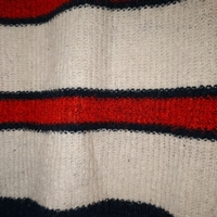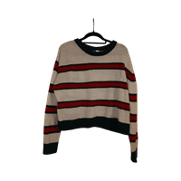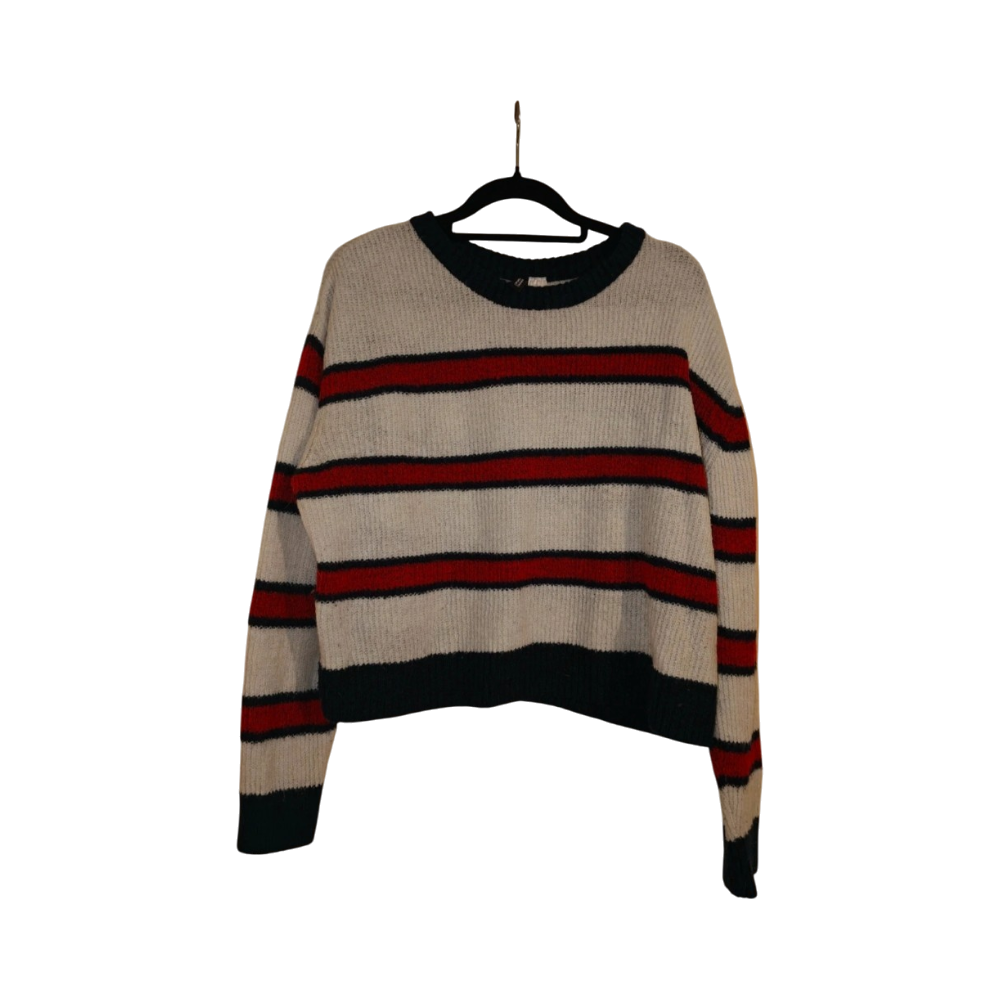 Valkoinen raidallinen neulepusero, pyöreä pääntie, rento istuvuus.