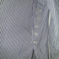 Blue and white vertical striped long-sleeve button shirt. Nice detail in the side seam, high-rise buttoning.