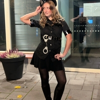 Short black police-style costume with belt and handcuff detail.